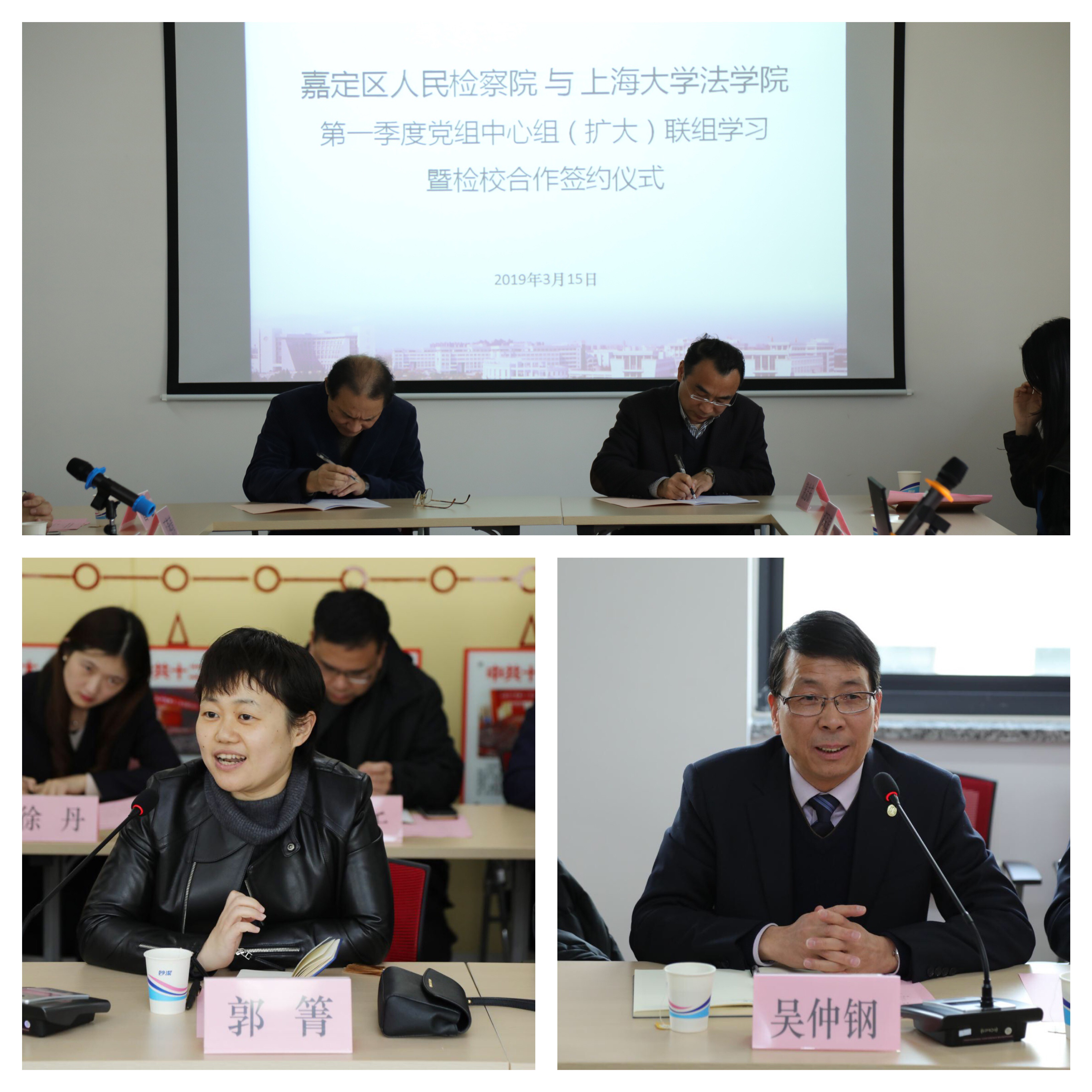 3月15日,嘉定区人民检察院党组书记、检察长高振国,党组成员、副检察长郭箐、孔杰、肖友广等一行30人到访澳门pg官方电子平台,在澳门pg官方电子平台504会议室举办党组中心组(扩大)联组学习暨检校合作签约仪式,澳门pg官方电子平台院长文学国,党委书记吴仲钢,副院长李凤章,党委副书记王国正,刑事诉讼法教授兰跃军及澳门pg官方电子平台中心组成员共13位领导老师出席了本次活动。双方紧密围绕习近平新时代中国特色社会主义思想,以全面加强依法治国,深入推进检校合作为主题,进行了交流与探讨。