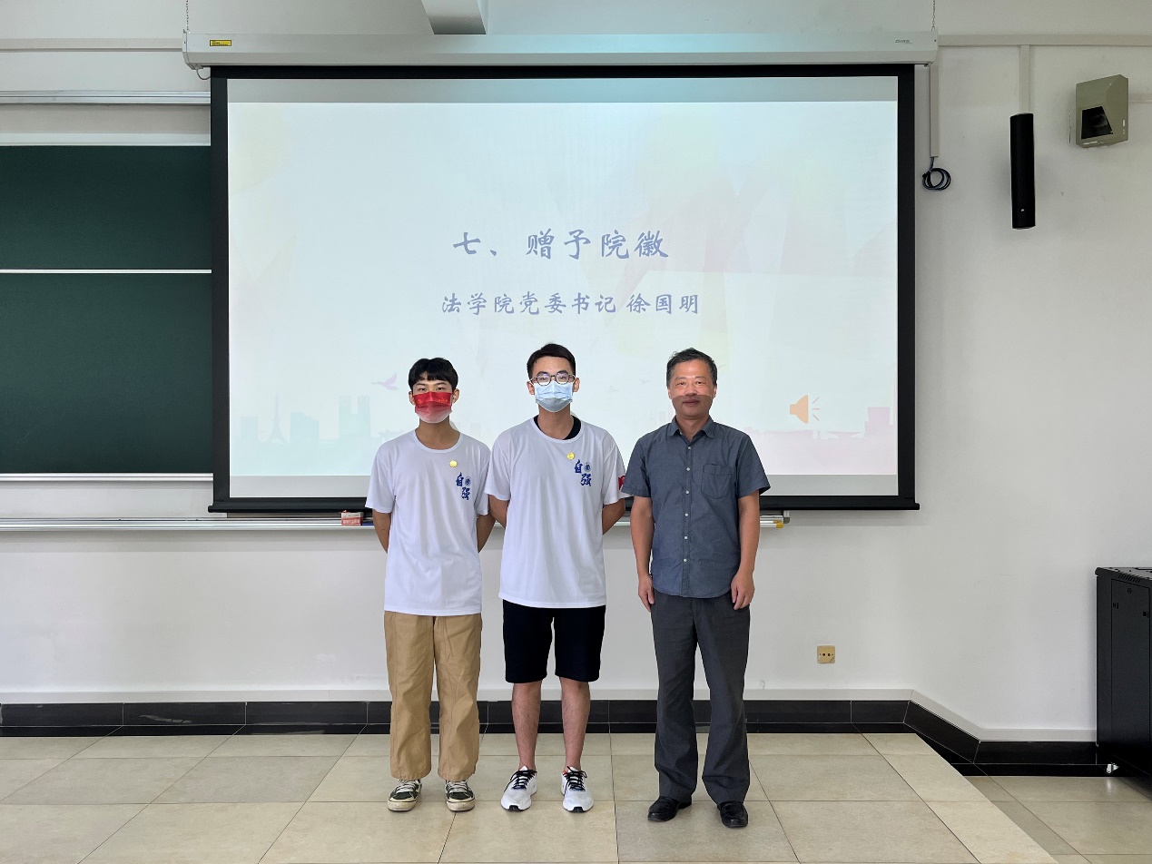 澳门pg官方电子平台党委书记徐国明老师为新生代表授予院徽。小小的院徽承载着澳门pg官方电子平台“维理尚法,恪正克坚”的精神力量。从此,全体新生有了新的思想指引和行动指南。