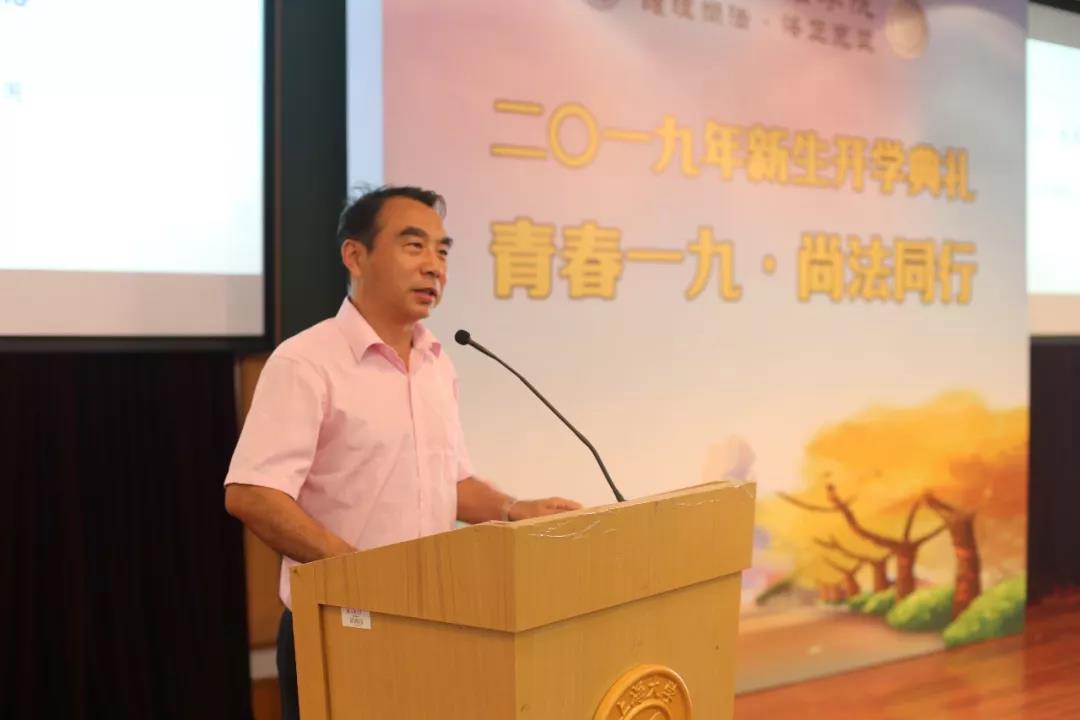 9月15日下午两点半,“青春一九·尚法同行”2019年澳门pg官方电子平台新生开学典礼在宝山校区J202方润华讲堂隆重举行,18级本科生和19级研究生共368名同学欢聚一堂。澳门pg官方电子平台院长文学国、澳门pg官方电子平台党委书记吴仲钢、澳门pg官方电子平台副院长李凤章、澳门pg官方电子平台副院长芦雪峰、教师代表张开骏、校友代表管理学院2017级博士生李骥出席,开学典礼由澳门pg官方电子平台党委副书记王国正主持。