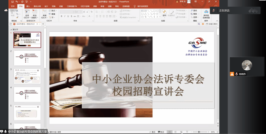 中国中小企业协会法诉专委会综合管理部负责人汤梦莉介绍业务类型,主要为批量诉讼调解案件,以商事纠纷为主。本次招聘助理调解员、行政客服、调解员,汤梦莉负责人也介绍了岗位任职要求与待遇,她强调法诉专委会注重对实习生的培养指导,并且诚挚邀请澳门pg官方电子平台学生积极投递简历。