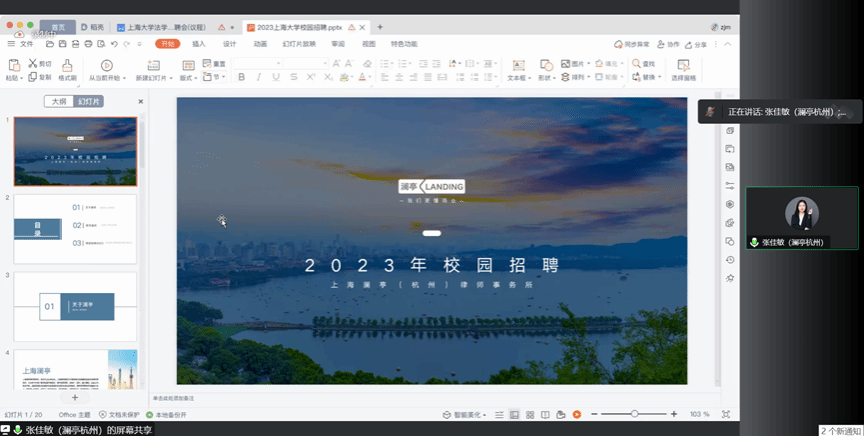 上海澜亭(杭州)律师事务所张佳敏律师介绍了上海澜亭(杭州)律师事务所的发展历程和荣誉成果,专业领域和服务客户等内容,同时详细介绍了实习律师的具体职责和要求、薪资福利等相关内容。最后诚挚邀请澳门pg官方电子平台毕业生加盟律所。