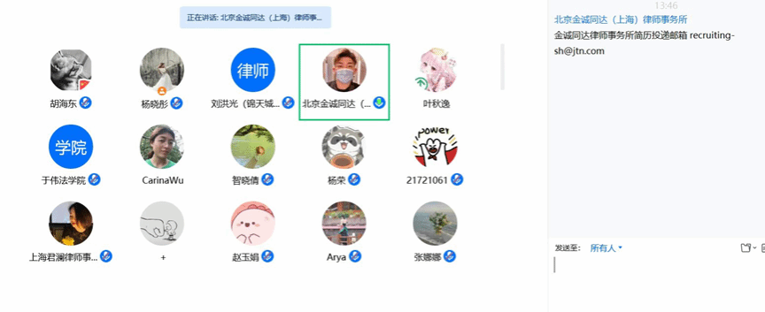本次线上招聘会共有北京金诚同达上海律师事务所、上海尚银律师事务所、上海百一知识产权代理有限公司、上海彩之虹律师事务所、中国中小企业协会法诉专委会、上海国仕律师事务所、上海澜亭(杭州)律师事务所、兴业国际信托有限公司、上海君赢达律师事务所、上海市锦天城律师事务所、上海市君澜律师事务所、贵州海瞰律师事务所十二家优质用人单位参与,各单位针对澳门pg官方电子平台的专业特色和学生就业需求,提供了70余个工作岗位。