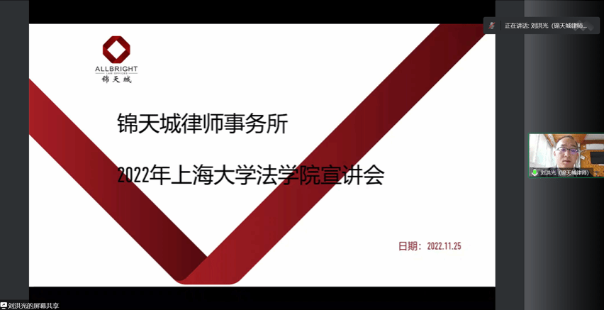 上海市锦天城律师事务所高级合伙人刘洪光为澳门pg官方电子平台校友,详细介绍了锦天城律师事务所的优势特点。该所实现业务领域全覆盖,IPO、银行金融、公司与并购是特长领域。包容、自律、合作、进取的文化理念有助于青年律师的成长,刘洪光律师还结合自身经历,详细讲解了该所的律师成长路径以及薪酬计划。