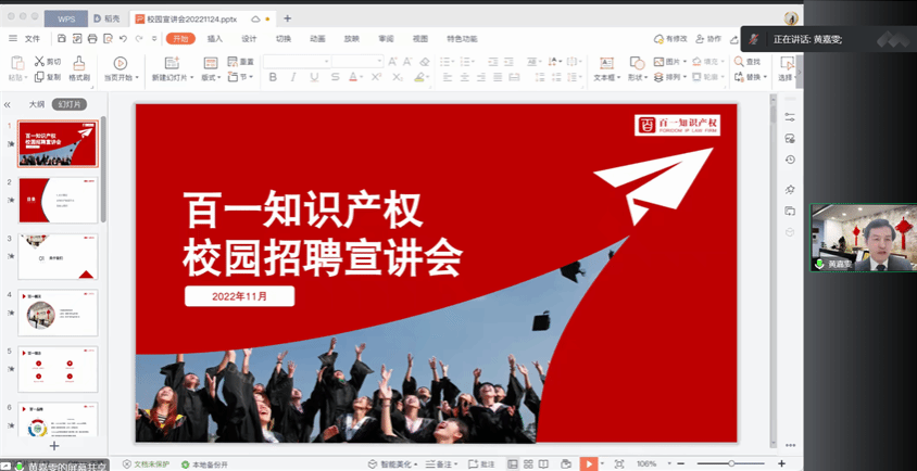 上海百一知识产权代理有限公司总经理王奎宇校友介绍了百一理念、品牌与获奖情况。该所十分认可澳门pg官方电子平台学生的水平,欢迎法学各专业的学生积极报名加入。王奎宇校友还讲述了我国知识产权立法及发展,介绍了该所的青年律师成长路径与福利待遇、招聘流程、招聘岗位要求等内容。