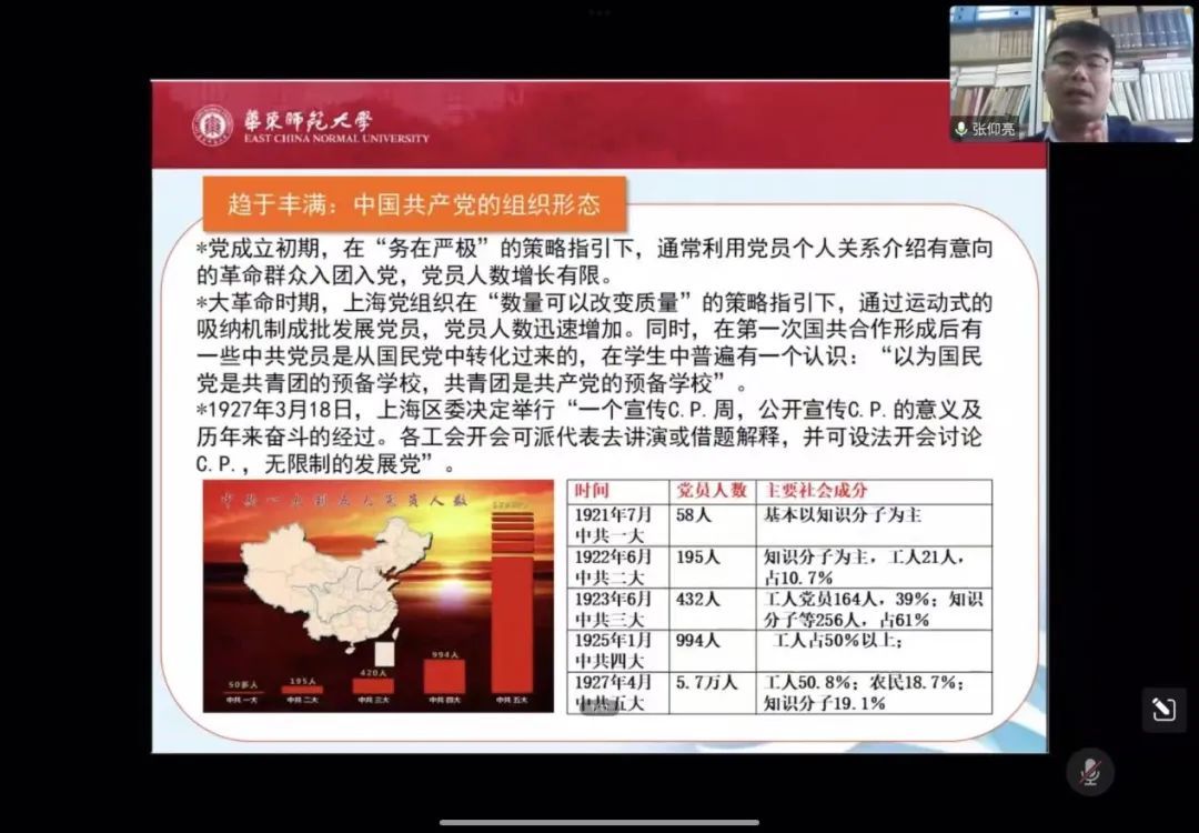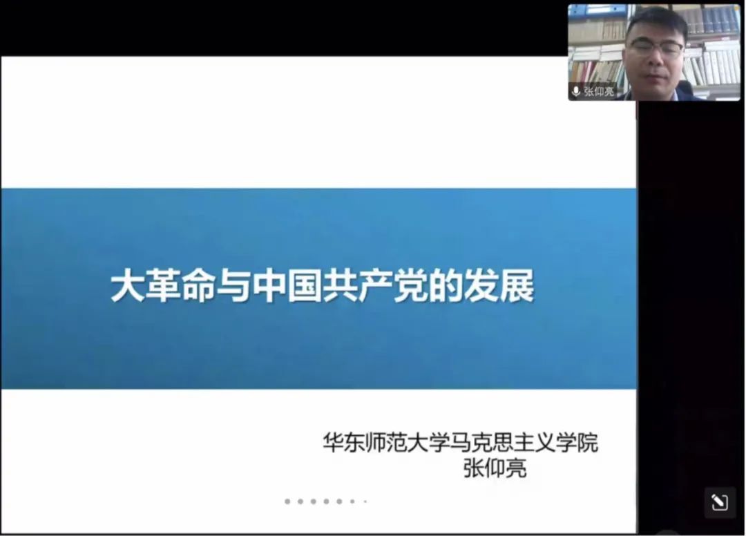 11月2日上午,澳门pg官方电子平台“星空尚法”计划暨2022年党史培训班专题讲座在腾讯会议平台顺利举行。华东师范大学马克思主义学院副教授张仰亮受邀以《大革命与中国共产党的发展》为题作主题讲座,澳门pg官方电子平台党委副书记、副院长于伟及澳门pg官方电子平台150余名同学参会。