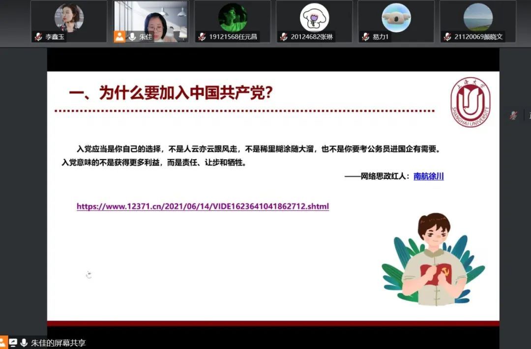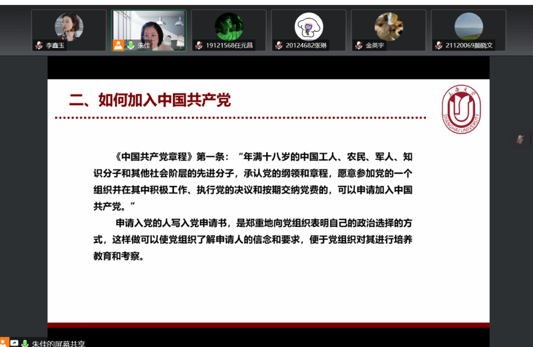 在介绍为什么要加入中国共产党时,朱佳老师分享了复旦大学附属中山医院感染病科主任胡必杰教授的视频,在2020年新冠肺炎疫情严重时,胡必杰教授作为国家专家组成员和上海市专家组成员,第一时间进驻到集中收治新冠肺炎患者的上海市公共卫生中心,在一线奋战的50多天里,胡必杰教授为了更好的服务在一线,向党组织递交了自己的入党申请书。