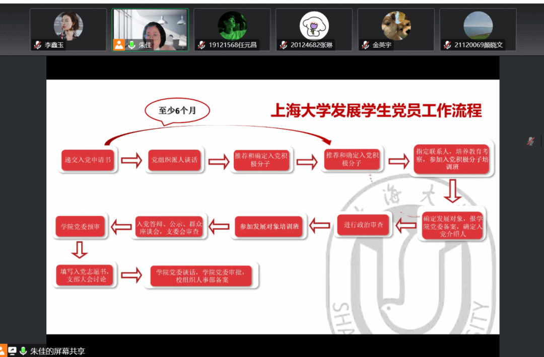 在介绍如何发展党员的基本程序和注意事项时,朱佳老师从申请入党、入党积极分子的确定和培养教育、发展对象的确定和考察、预备党员的接收、预备党员的教育考察和转正五个方面进行讲解,并对具体流程中的注意事项进行了细致的介绍。