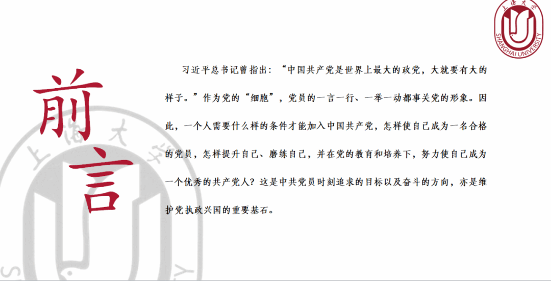 为贯彻落实中共中央、国务院《关于进一步加强和改进大学生思想政治教育的意见》和上海市科教党委关于在大学生中切实加强党史教育的意见,澳门pg官方电子平台特组织此次本科生、研究生入党申请人学习中共党史培训班,期望通过党史教育培训,帮助学员加强对党史的学习和了解,加深对党的历史知识的认识,把握党员标准,端正入党动机,争取早日入党!