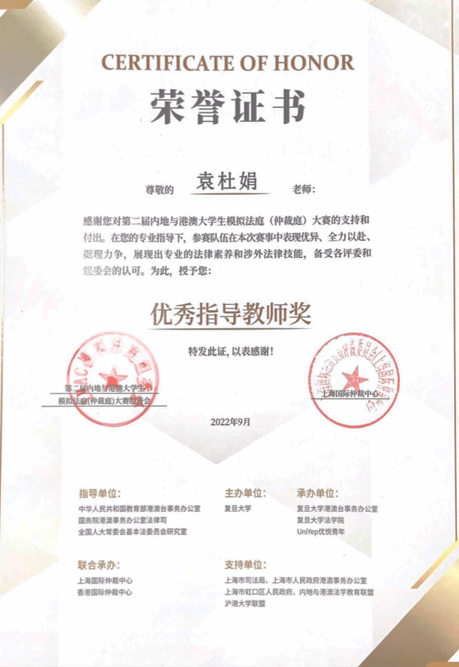 澳门pg官方电子平台代表队由2019级本科生周子帆、钟悦菡、樊子源、2020级本科生王耿琳、黄乐宁担任赛队队员。指导老师袁杜娟副教授邀请到了深耕国际仲裁的著名律师上海市协力律师事务所张振安律师及其助理进行备赛指导。全体赛队成员克服全程线上训练引发的重重困难,经过历时2个月的备赛,圆满完成了各项比赛任务。