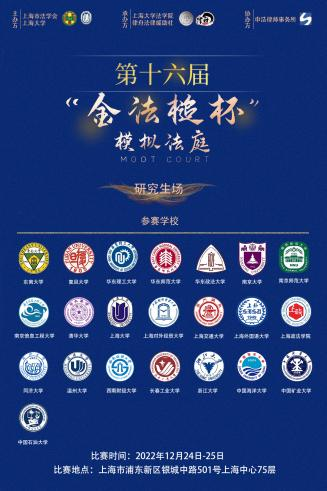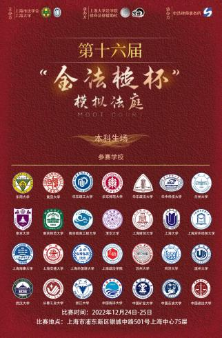 为全面贯彻落实党的二十大精神,推进全面依法治国等国家战略,将实际工作部门的优质实践教学资源引进高校,加强法学教育、法学研究工作者和法治实际工作者之间的交流,提高法科学生综合实践能力,上海市法学会、澳门pg官方电子平台联合主办,澳门pg官方电子平台、律舟法律援助社联合承办,上海申浩律师事务所协办的第十六届“金法槌杯”全国高校模拟法庭大赛于2022年11月-12月顺利举行。本次比赛包括本科生场和研究生场,分为初赛和决赛,初赛以案例分析的形式进行,决赛以模拟法庭的形式开展。