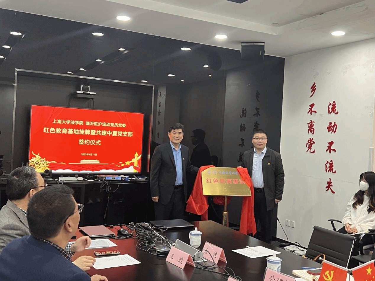4月11日上午,澳门pg官方电子平台党委与山东省临沂市驻沪流动党员党委在浦东新区共同举行上海沂蒙精神展馆揭牌暨共建中夏党支部签约仪式。澳门pg官方电子平台党委副书记、副院长于伟、全体本研辅导员、澳门pg官方电子平台中夏党支部、法正党支部师生党员,山东省临沂市政府副秘书长、临沂驻沪流动党员党委书记、市政府驻上海联络处主任王相恩,临沂驻沪流动党员党委副书记李德刚及临沂驻沪流动党员党委、驻沪联络处相关党员干部等40余人出席仪式。