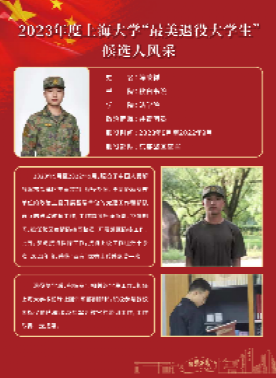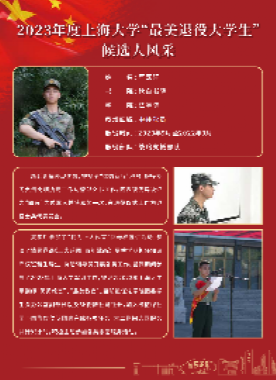严嘉轩,2020年9月至2022年9月服役于中国人民解放军战略支援部队。服役期间,在新兵训练中表现优异,被授予“优秀新兵”称号;负责岗哨执勤工作与营部文书工作;因表现优异被评为“四有”优秀军人并获嘉奖一次;在退役仪式上作为退役士兵代表发言。复学后参加了“我为上大代言”回母校宣讲活动;参演了情景党课《上大蓝图,百年擘画》;夏季学期担任知识产权班新生导生,协助辅导员开展各类工作;暑假期间参与了2023年澳门pg官方电子平台军训工作,被评为2023年澳门pg官方电子平台军训师“优秀教官”、“最美教官”;目前担任澳门pg官方电子平台团委学生会办公室副部长以及SK街舞社副社长,加入橄榄绿社团与国旗仪仗队圆满完成各项任务;大二期间志愿服务共计83小时,积极主动参加各类志愿服务活动。在本次终评会议中荣获“最美退役大学生”提名荣誉称号。