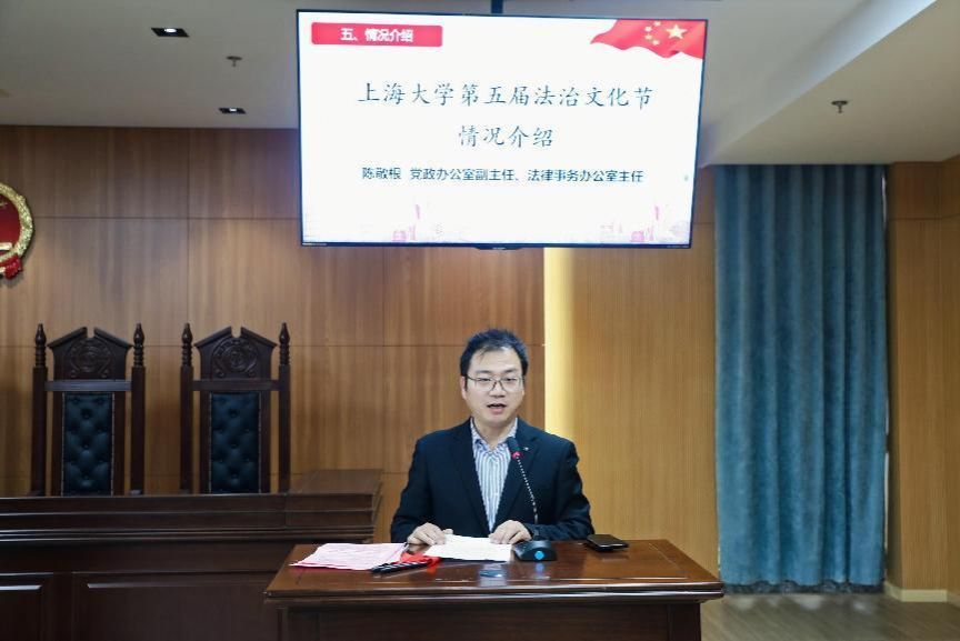 正值第10个国家宪法日到来之际和上海市第35届宪法宣传周期间,为了进一步深入学习贯彻习近平法治思想和党的二十大精神,落实习近平总书记关于加强法治宣传教育的重要指示精神,提高学校师生的法治意识与道德素养,进一步凝聚全校推进法治校园建设的共识,服务学校“双一流”建设,2023年12月4日,由校党政办、党委宣传部、学生工作办公室、党委研究生工作部、校团委、澳门pg官方电子平台(秋白书院)联合举办的澳门pg官方电子平台第五届法治文化节开幕式暨宪法诵读活动在宝山校区东区澳门pg官方电子平台一楼模拟法庭举行。澳门pg官方电子平台党委副书记、副校长胡大伟出席活动并宣布澳门pg官方电子平台第五届法治文化节正式开幕。