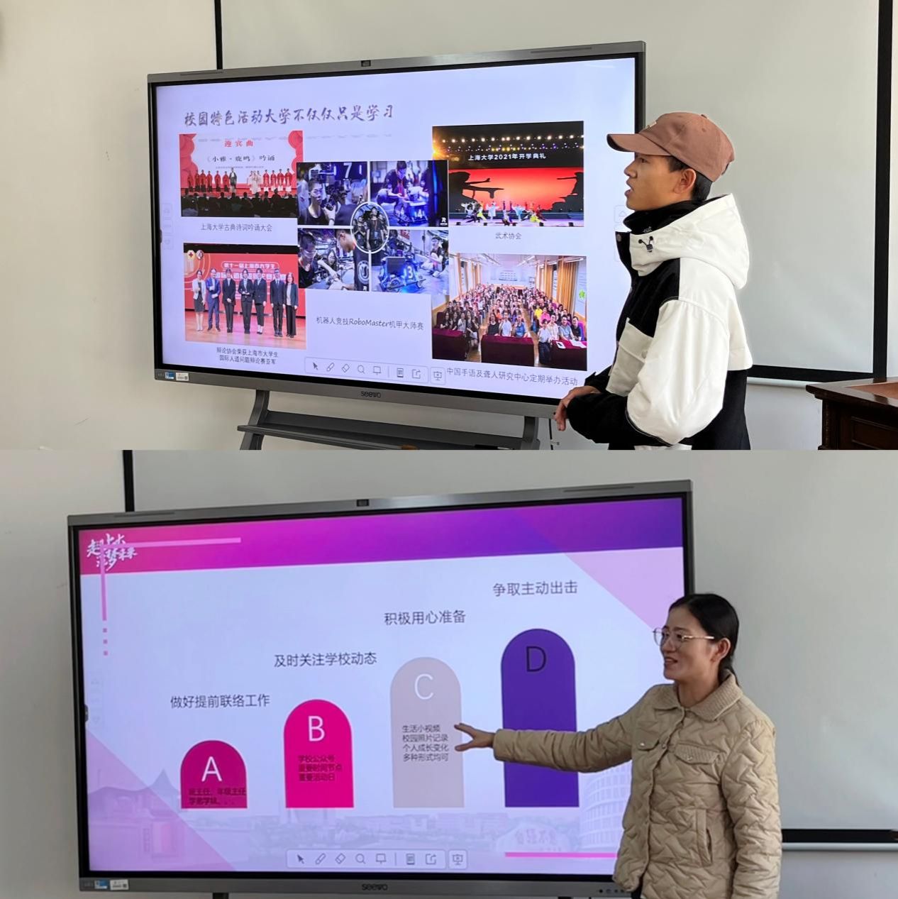 为了让同学们更好地开展宣讲实践活动,培训会邀请了去年参与该活动的任元昌同学和大家一起交流分享,任同学毕业于贵州省兴义市第八中学,他分享了宣讲经历和感悟,介绍了宣讲的前期准备、宣讲技巧和注意事项以及如何撰写最后的实践报告等。公老师对本次实践活动的具体流程与安排,进行了详细讲解,对贵州省近几年的招生录取情况给同学们做了详实的数据分析,并鼓励同学们积极报名参与“把上大说给你听”的主题征文活动