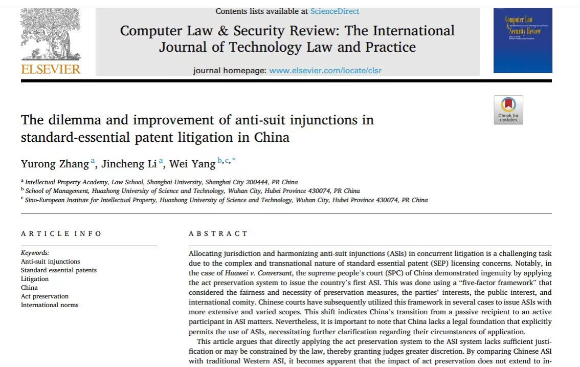 2023年12月,澳门pg官方电子平台张玉蓉老师作为第一作者在国际著名的SSCI一区法学期刊《计算机法律与安全评论》(Computer Law & Security Review,CLSR)上发表学术论文《The dilemma and improvement of anti-suit injunctions in standard-essential patent litigation in China》。这是张玉蓉老师主持的国家社科基金“新一代信息技术企业标准必要专利竞争战略研究”(20BGL043)的重要成果。