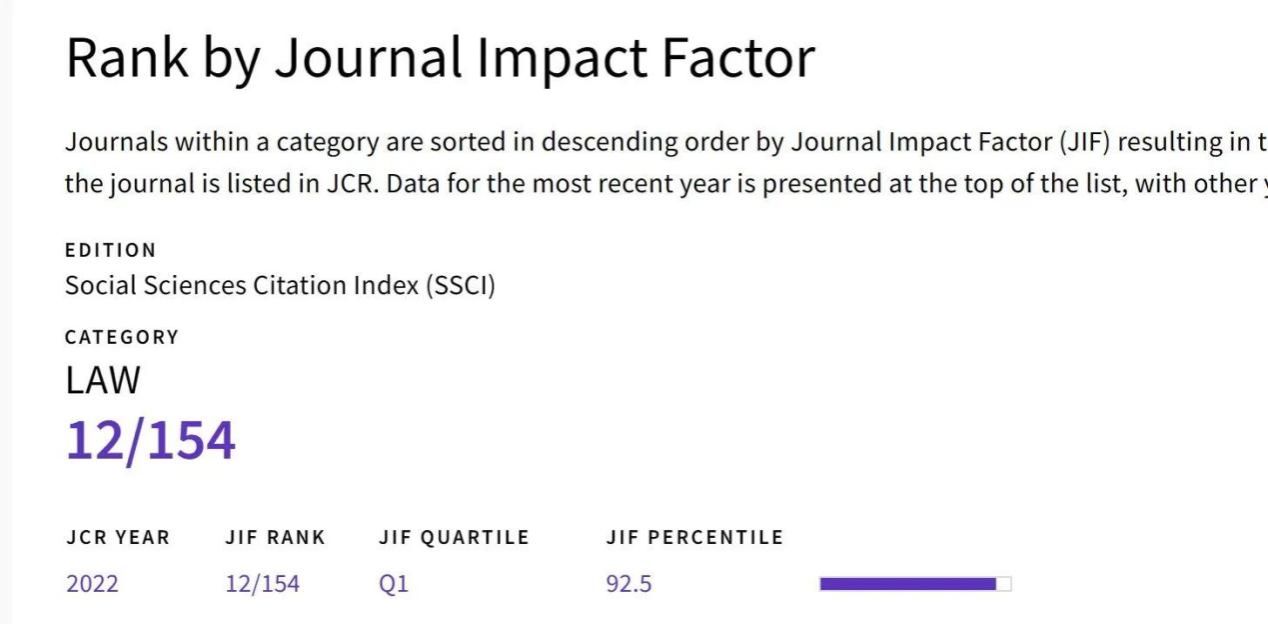 CLSR由英国著名网络法学者Steve Saxby教授于1985年创办,每年出版六期,是以互联网法律、网络安全、数据保护、电子商务等网络前沿问题为主要特色的著名国际性学术期刊,是世界范围内科技法律期刊中为数不多入选SSCI目录的法学类国际性期刊。根据汤森路透2023年度发布的最新期刊引证报告(JOURNAL CITATION REPORTS,简称JCR)显示,CLSR影响因子为2.9,在152本入选的SSCI法学刊物中位列第12位,属于JCR Q1区优势期刊。