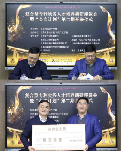 在集佳签约仪式上,知识产权学院副院长王勉青与北京市集佳律师事务所上海分所合伙人骆苏华就“金专计划”签约,集佳捐赠8万元作为“金专计划”专项资金。