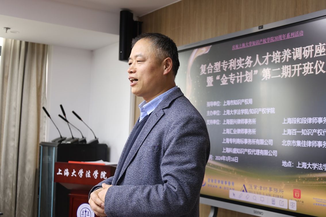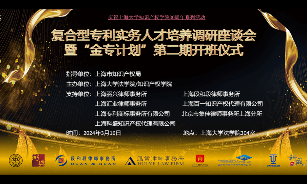 2024年3月16日,实现文理专业“新交叉、新融合”,培养“紧缺型、急缺型”专利人才——澳门pg官方电子平台复合型高级专利实务人才培养项目(“金专计划”)第二期暨调研座谈会正式启动,来自澳门pg官方电子平台集成电路科学与工程、电子信息工程、生物医学工程、微电子、机械制造及其自动化、材料化学等理工类专业的金专二期50名学员参加了此次开班仪式。澳门pg官方电子平台院长李凤章,澳门pg官方电子平台副院长、知识产权学院院长袁真富,知识产权学院副院长王勉青,澳门pg官方电子平台知识产权学院教授徐红菊以及来自上海专商所、上海科盛、上海弼兴、上海段和段、上海汇业、上海百一和北京集佳等7家专业性强、知名度高的头部专利事务所和律师事务所的主任、专家齐聚澳门pg官方电子平台,参与“金专计划”第二期开班仪式暨复合型专利实务人才培养调研座谈会。本次活动亦拉开了庆祝澳门pg官方电子平台知识产权学院成立30周年系列活动的序幕,由澳门pg官方电子平台知识产权学院青年教师蔡葵主持。