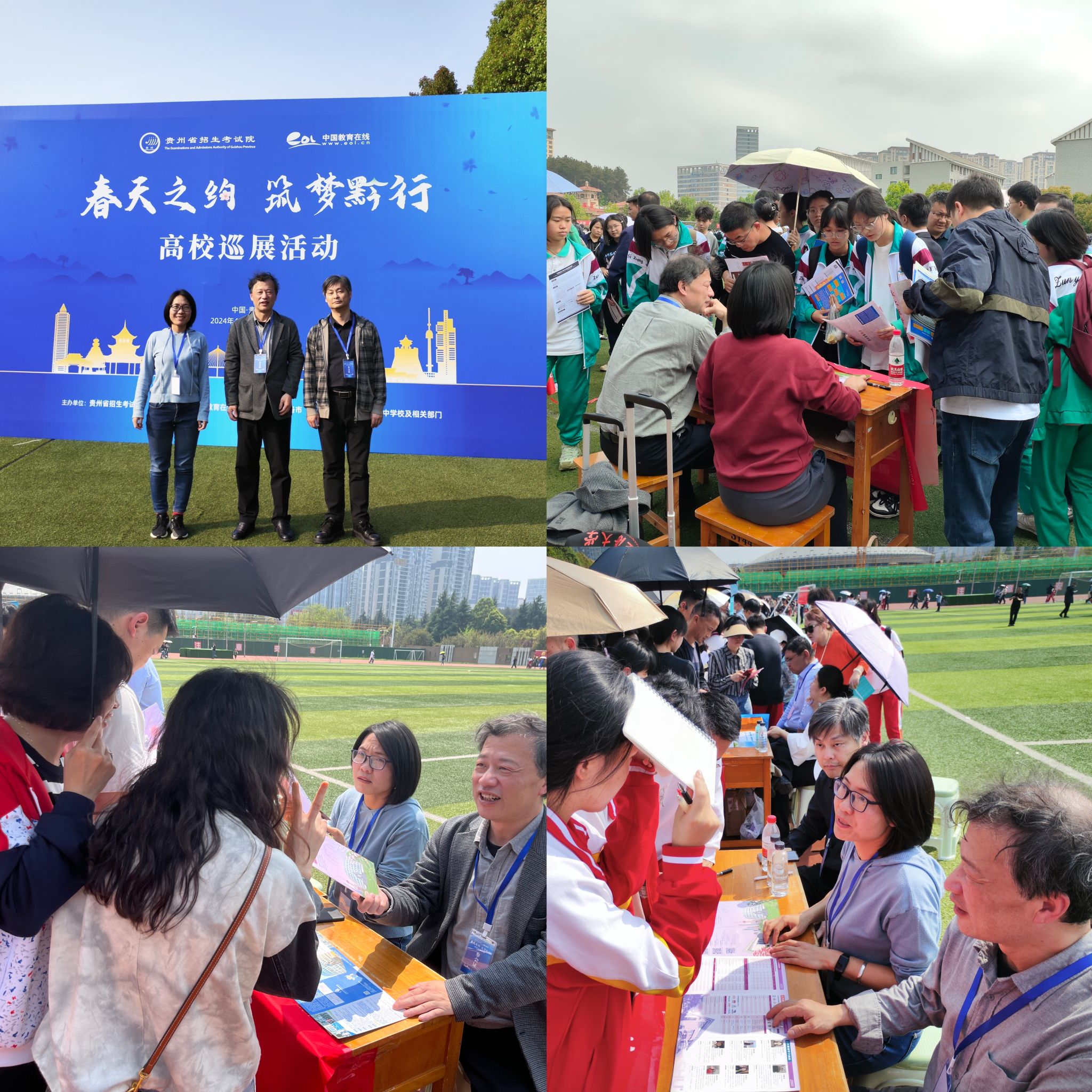 4月12、13日澳门pg官方电子平台贵州招宣组组长徐国明,澳门pg官方电子平台办公室主任江晓双以及悉商招生负责老师何骋前往贵阳市第一中学和遵义四中开展招生咨询活动。相关高中的学生家长和考生纷纷前来咨询台,就自身关心的专业选择、学校培养特色、就业情况等进行咨询,老师们给予了热情而又专业的回答。