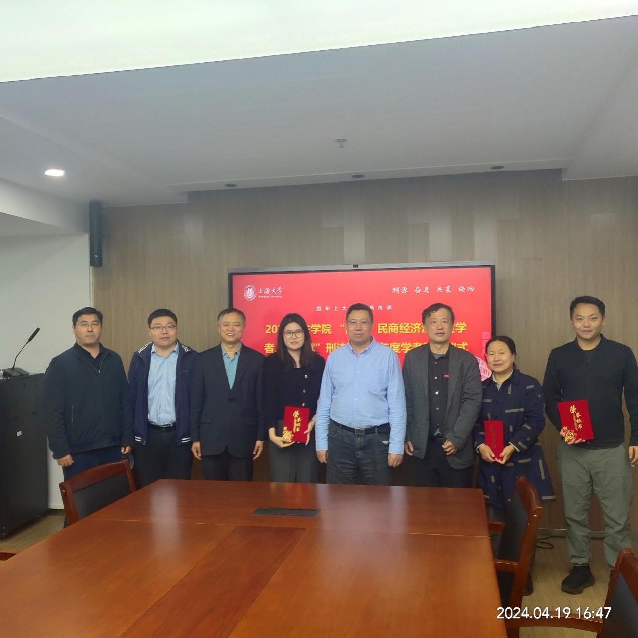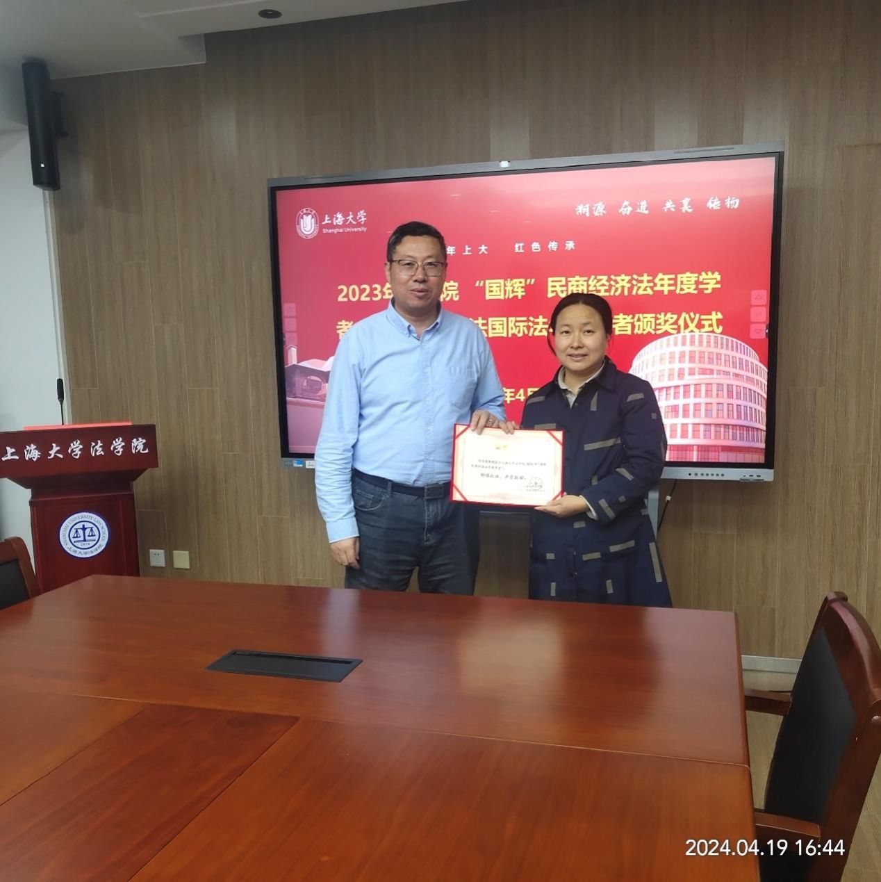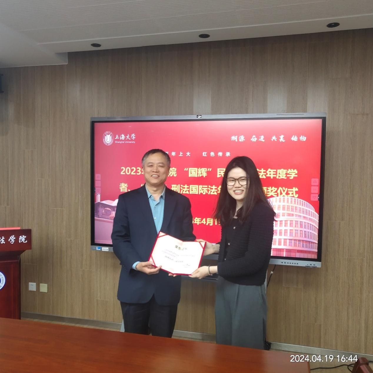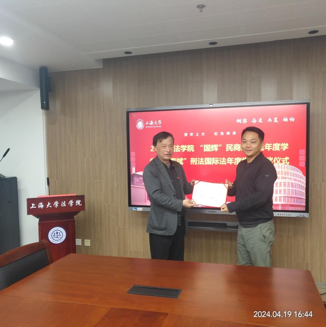 2024年4月19日下午,澳门pg官方电子平台“国辉”民商经济法年度学者、“海斌”刑法国际法年度学者颁奖仪式在上大宝山东校区澳门pg官方电子平台304会议室举行。上置集团董事会主席秦国辉博士出席并为获评2023年度“国辉”民商经济法年度学者的刘迎霜教授颁发获奖证书,受北京大成(上海)律师事务所金融犯罪研究中心主任朱海斌律师委托,澳门pg官方电子平台党委书记徐国明、澳门pg官方电子平台院长李凤章分别为获评2023年度“海斌”刑法国际法年度学者的袁曾副研究员和林雨佳博士颁发获奖证书。澳门pg官方电子平台党委副书记、副院长于伟,澳门pg官方电子平台副院长袁真富以及部分教师代表出席了颁奖仪式。