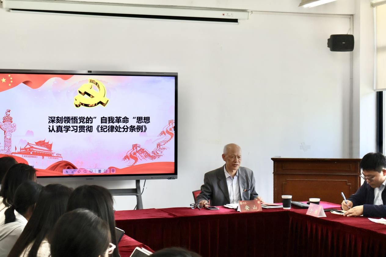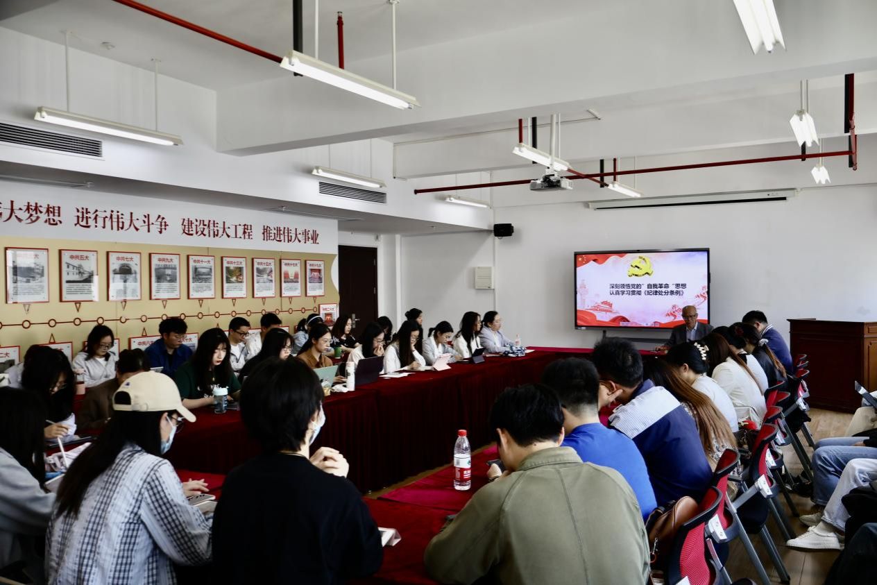 5月10日下午,澳门pg官方电子平台学生党员和积极分子党纪学习教育主题报告会在宝山校区澳门pg官方电子平台504会议室顺利举行。澳门pg官方电子平台特邀党建组织员、澳门pg官方电子平台信访办原主任安山老师应邀作题为《深刻领会党的“自我革命”思想,认真学习贯彻中国共产党纪律处分条例》的主题报告,澳门pg官方电子平台党委副书记、副院长于伟,研究生辅导员朱佳以及中夏党支部、法正党支部等学生党员、学生党支部书记以及新一批入党积极分子等共同参加学习。