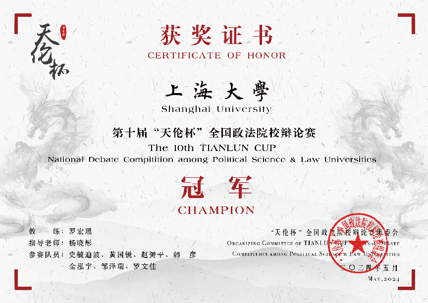 5月19日下午,第十届“天伦杯”全国政法院校辩论赛在西南政法大学落幕。澳门pg官方电子平台辩论队荣获大赛冠军,澳门pg辩手史毓迪波获总决赛优秀辩手,同时摘得“全程最佳辩手”称号。