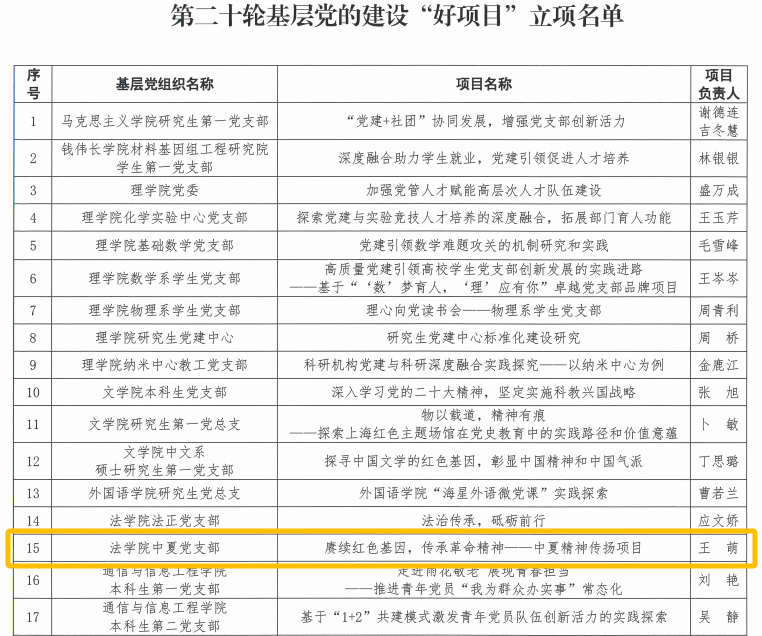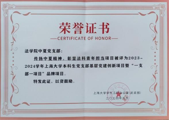 中夏党支部秉承中夏精神,积极开展中夏精神传承项目,成功立项澳门pg官方电子平台第二十轮基层党的建设“好项目”和澳门pg官方电子平台2023及2024年度本科生党支部基层党建创新项目暨“一支部一项目”。通过深化项目内涵、加强实践交流、强化党员培训以及建立跟踪评估机制,彰显法科青年的担当,培养具有专业素养和社会责任感的法治建设者,为推动法治中国建设贡献青春力量。