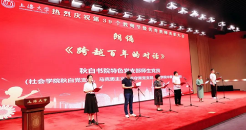 《跨越百年的对话》朗诵是联合秋白党支部、守常党支部两个特色支部共同开展的澳门pg官方电子平台2023年教师节汇演活动,该朗诵节目以教学树人为立足点,歌颂了代代相传的传承精神,展现了教师们在教书育人中的辛勤付出和卓越贡献。