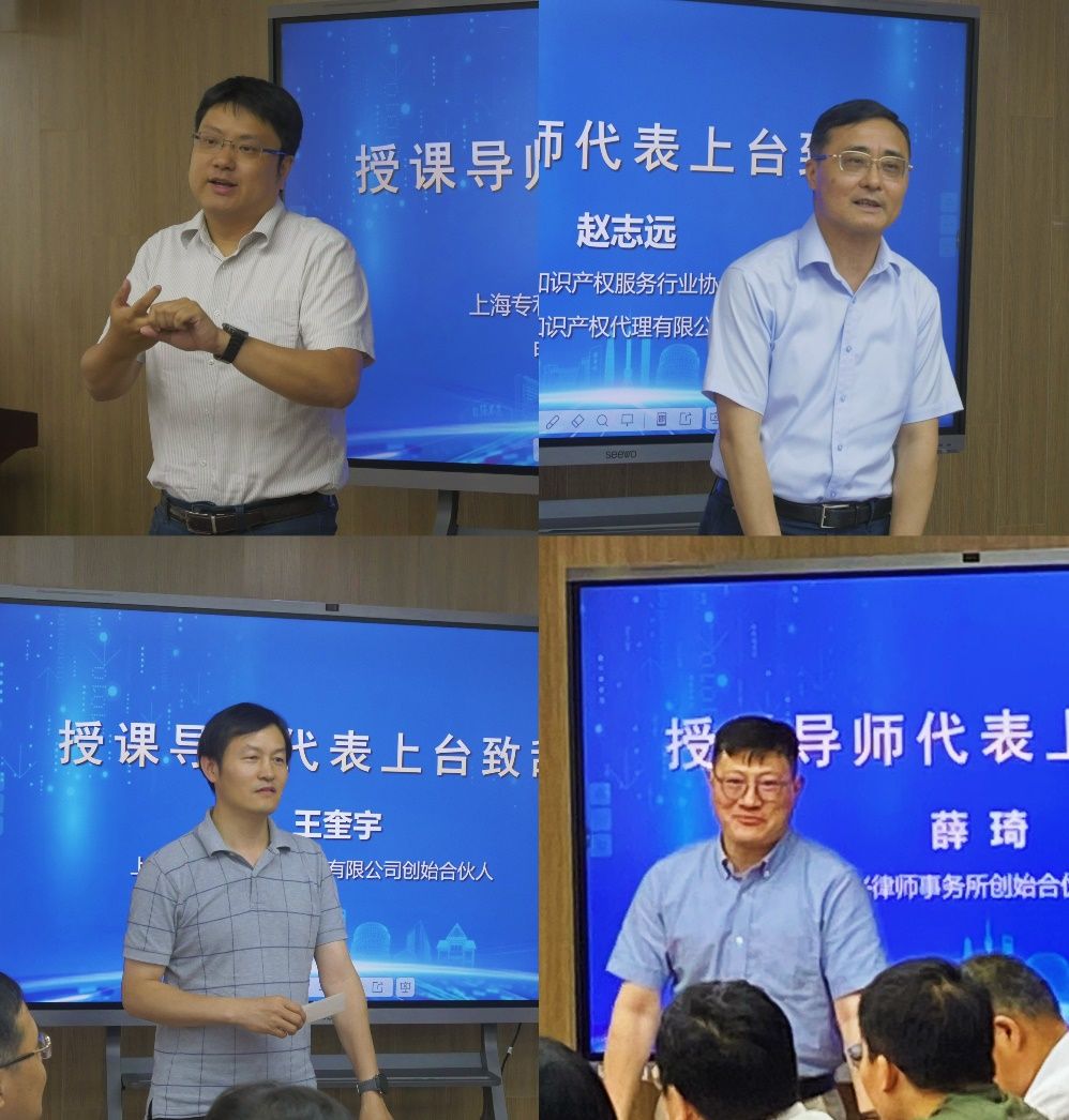 上海市知识产权服务行业协会会长、上海科盛知识产权代理有限公司总经理赵志远,上海弼兴律师事务所创始合伙人、主任薛琦,上海段和段(虹桥国际中央商务区)律师事务所副主任、合伙人李佳俊,上海专利商标事务所有限公司合伙人、电学物理事业部总经理张鑫,上海汇业律师事务所高级合伙人王函,上海百一知识产权代理有限公司创始合伙人王奎宇,北京市集佳律师事务所上海分所合伙人李文红,上海瓴慧律师事务所合伙人甄书琦,上海弼兴律师事务所高级合伙人钟华作为本次“金专计划”的授课导师代表,依次向大家分享了自己对于“金专计划”的授课体会,阐述了对于专利实务人才的培养过程中的心得感受,肯定了专利实务人才的行业憧憬与就业前景。
