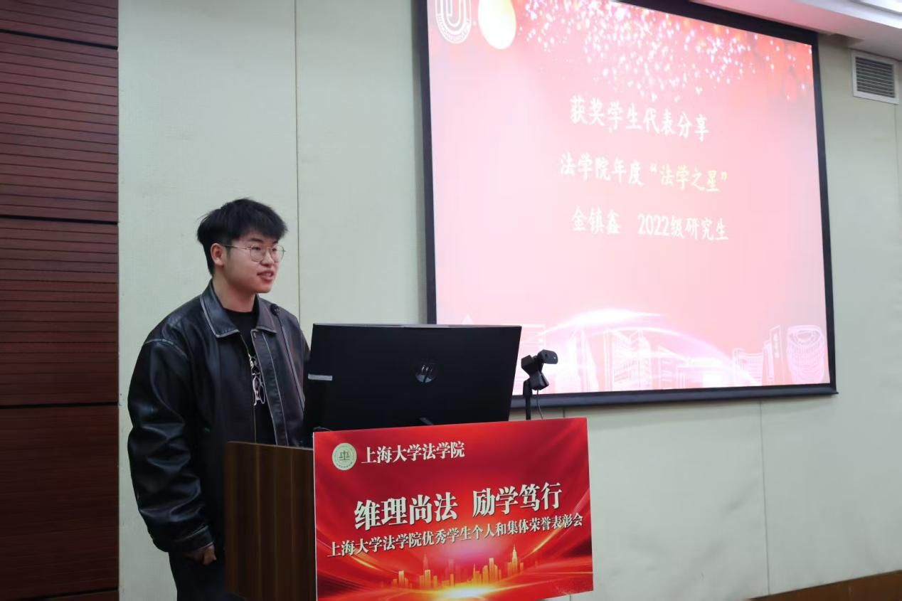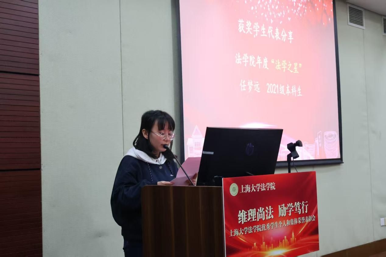 颁奖仪式结束后,两位澳门pg官方电子平台年度“法学之星”上台分享自身感悟。澳门pg官方电子平台2021级本科生任梦远向一直以来辛勤付出的老师们以及共同成长的同学们表示最衷心的感谢,同时也感谢澳门pg官方电子平台为大家提供的相当多的平台与机会。她回顾了本科参加的许多比赛与学术论坛,鼓励大家不要只着眼于眼前利益,应该勇于应对挑战,说不定会获得新的机遇,并在最后用“取法乎上,得乎其中;取法乎中,得乎其下”与大家共勉。