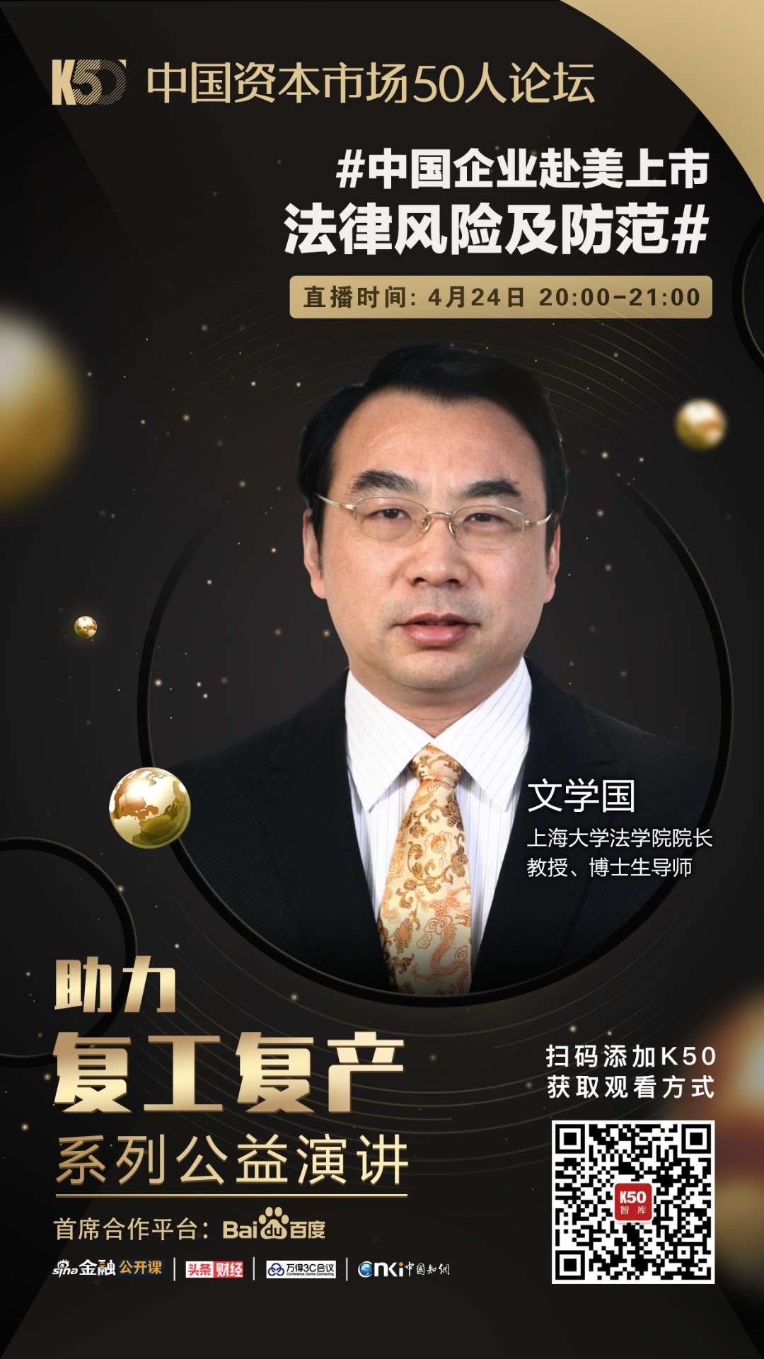 4月24日晚八点,受中国资本市场50人论坛的邀请,澳门pg官方电子平台院长、博士生导师文学国教授参与助力复工复产系列公益演讲在百度直播间开播,本期主题为“中国企业赴美上市法律风险及防范”。