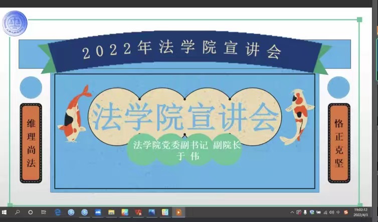 2022年4月3日晚,澳门pg官方电子平台走进社区学院人文大类宣讲会在线上腾讯会议室顺利举行。参加本次宣讲会的领导和嘉宾有澳门pg官方电子平台副院长芦雪峰,澳门pg官方电子平台教授、博导王勉青老师,澳门pg官方电子平台青年教师刘住洲博士,澳门pg官方电子平台校友、上海中联律师事务所高级合伙人丁俊涛律师,澳门pg官方电子平台校友、德恒上海律师事务所合伙人陈哲律师,澳门pg官方电子平台2018级法学专业本科生白居政,澳门pg官方电子平台2018级知识产权专业本科生柏依洋。社区学院人文大类的200余名师生积极参加了本次宣讲会。宣讲会由澳门pg官方电子平台党委副书记、副院长于伟主持。