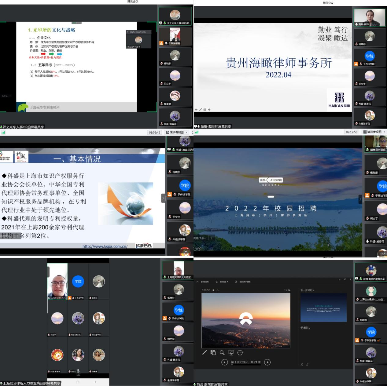 上海光华专利事务所、贵州海瞰律师事务所、上海科盛知识产权代理有限公司、上海澜亭(杭州)律师事务所、上海市信义律师事务所、上海蔚来汽车有限公司等优质单位提供了包括商标代理人助理、知识产权管理销售、专利事务律师、数据合规法律顾问、实习律师、律师助理等31个工作岗位。招聘宣讲人员主要从单位概况、招聘岗位、人才培养计划、福利补贴等方面进行宣讲介绍。通过对核心业务板块、竞争优势、岗位特性、业务特点、人才培养机制、办公环境等方面的介绍,同学们初步了解到公司概况与企业文化。各用人单位都特别介绍了本单位的人才培养计划,还就毕业生关心的薪资福利等问题进行了讲解。
