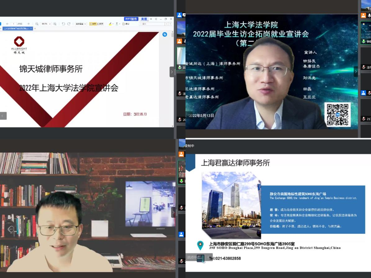本次线上招聘会共有北京金诚同达(上海)律师事务所、上海市锦天城律师事务所、上海兰迪律师事务所、上海君赢达律师事务所四家优质律所参与,四家律所针对澳门pg官方电子平台的专业特色和学生就业需求,提供了专业对口的律师助理、实习生等若干工作岗位。各律所宣讲人向同学们介绍了律所的业务范围、工作环境、职业发展及招聘岗位的具体要求。多名律师校友在结合自身职业经历的基础上,分别从求职学生角度和律师事务所角度,对投递实习简历、进入律所实习、成为青年律师的三个不同阶段所需注意的要点进行提示,鼓励同学们在进行职业规划时放平心态,主动争取磨砺和提高个人能力的机会;并在工作中认真务实关注细节,培养自身对于律师职业工作强度的耐受力。在宣讲会的自由交流环节,同学们围绕薪资待遇、转正要求、职业发展前景等问题与宣讲人积极互动,各用人单位就同学们关心的问题进行了耐心、详细的解答。