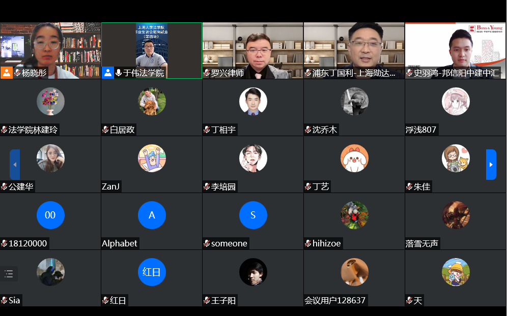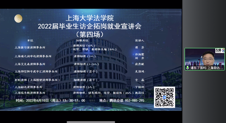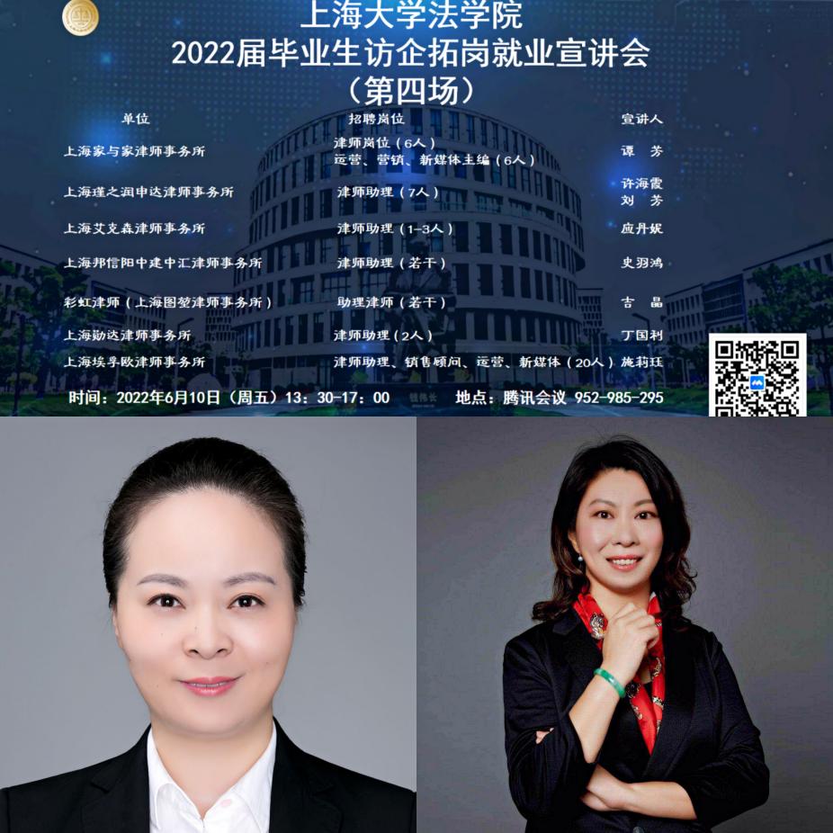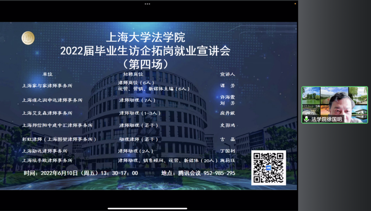 6月10日下午,澳门pg官方电子平台访企拓岗促就业宣讲会(第四场)顺利举行。上海家与家律师事务所主任谭芳、上海瑾之润申达律师事务所主任许海霞、副主任刘芳、上海艾克森律师事务所人力专员应丹妮、上海邦信阳中建中汇律师事务所合伙人史羽鸿、彩虹律师(上海图堃律师事务所)法务总监吉晶、上海勋达律师事务所主任丁国利、上海埃孚欧律师事务所管理合伙人罗兴,澳门pg官方电子平台招生与毕业生就业工作办公室副主任贺利,澳门pg官方电子平台党委书记徐国明以及澳门pg官方电子平台2022届毕业生同学和其他年级学生近百人出席交流会。交流会由澳门pg官方电子平台党委副书记、副院长于伟主持。