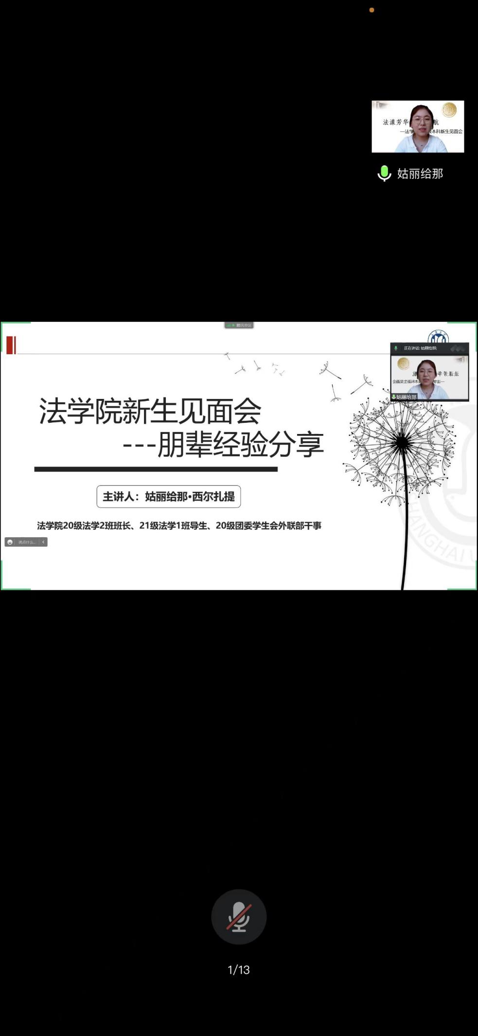 澳门pg官方电子平台2018级本科生苏晨曦与澳门pg官方电子平台2020级本科生姑丽给那•西尔扎提向2021级本科新生作朋辈分享。苏晨曦从自己本科期间的收获和经历进行分享,指出来到澳门pg官方电子平台将收获一条没有止境的求知之路,收获一种思考问题的方式,收获一个用理性看待世界的角度;并从背书、考试周与法考三个方面介绍了自己的经历,勉励同学们以轻松的心态面对未来。她建议同学们一是要多阅读经典著作,二是要提前做好生涯规划。姑丽给那从如何适应澳门pg官方电子平台、在澳门pg官方电子平台就读期间如何度过以及离开澳门pg官方电子平台后的未来三个方面进行了分享,对于学业与学生工作如何平衡进行了分享,对于专业课学习方法、未来生涯规划等进行了介绍。