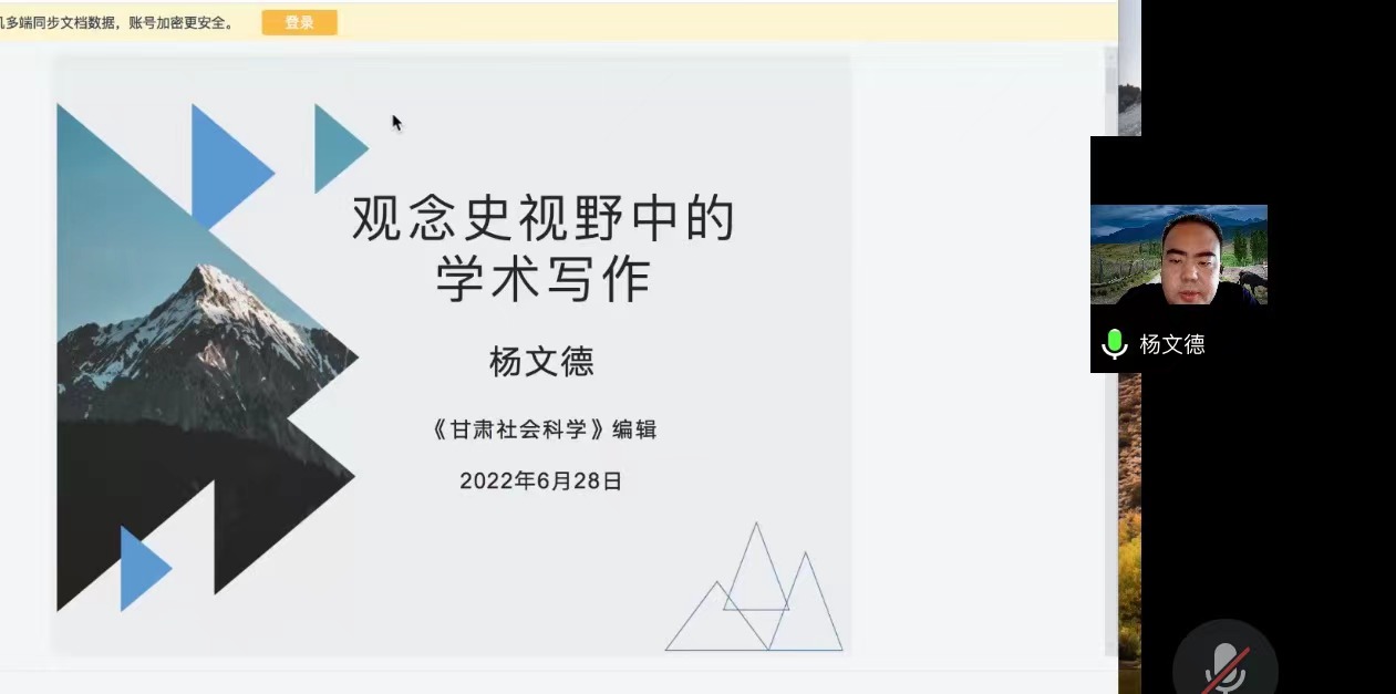 2022年6月28日下午3点,澳门pg官方电子平台泮池法学论坛第98期在腾讯会议线上顺利举行。本次讲座的主题为“观念史视野中的学术写作”,主讲人是澳门科技大学法学博士杨文德。杨文德博士是《甘肃社会科学》《澳门法政杂志》编辑,《甘肃法治建设报告》副主编,《陇上学人文存》学术编辑,同时发表学术论文、文学评论、人物评访等十余篇。主持、参与国家社科、中国法学会及省社科项目多项,获中国版协优秀图书奖、省社科优秀成果奖、省出版科研优秀论文奖等多项。讲座由澳门pg官方电子平台讲师李晨光主持,《高等学校文科学术文摘》常务副主编、法学栏目责任编辑沈丽飞、澳门pg官方电子平台特聘教授刘迎霜作为评议人参与会谈。