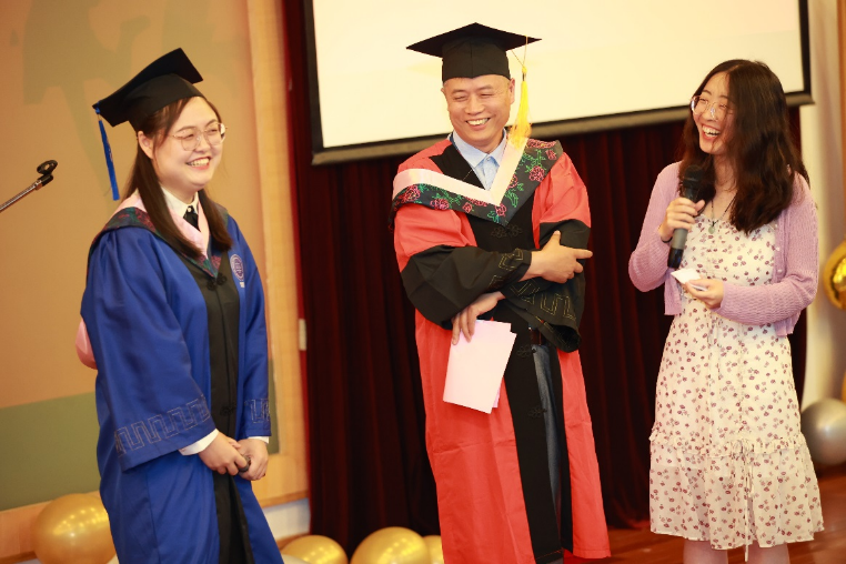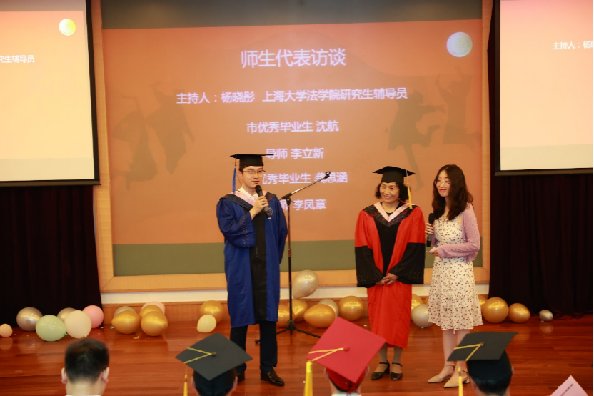 澳门pg官方电子平台研究生辅导员、团委副书记杨晓彤老师主持师生代表交流发言,上海市优秀毕业生代表沈航、龚思涵同学以及他们的导师李立新、李凤章老师上台进行分享他们的师生故事。