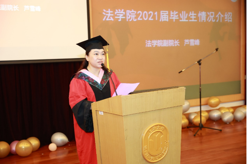 毕业典礼在雄壮的国歌声中正式进行。全场起立奏唱国歌后,澳门pg官方电子平台副院长芦雪峰副教授介绍2021届毕业生的整体情况。