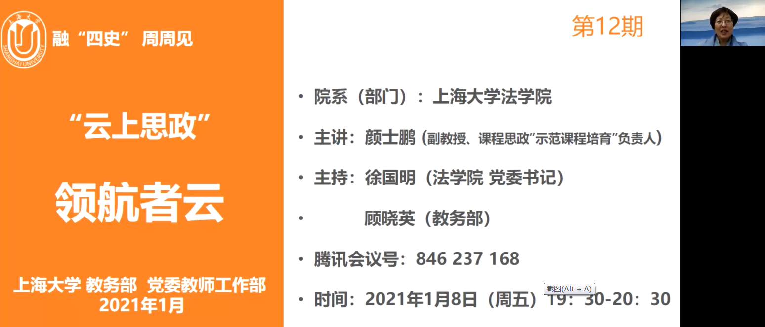 2021年1月8日晚19点30分,第十二期澳门pg官方电子平台“云上思政”——领航者云教师培训活动如期开展。此次培训由澳门pg官方电子平台教务部、党委教师工作部主办,澳门pg官方电子平台承办。澳门pg官方电子平台颜士鹏副教授受邀主讲,澳门pg官方电子平台副院长芦雪峰担任互动嘉宾。澳门pg官方电子平台党委书记徐国明和校教务部副部长顾晓英教授联袂主持活动。本校多名院系教师及西安邮电大学等兄弟院校师生线上参会。