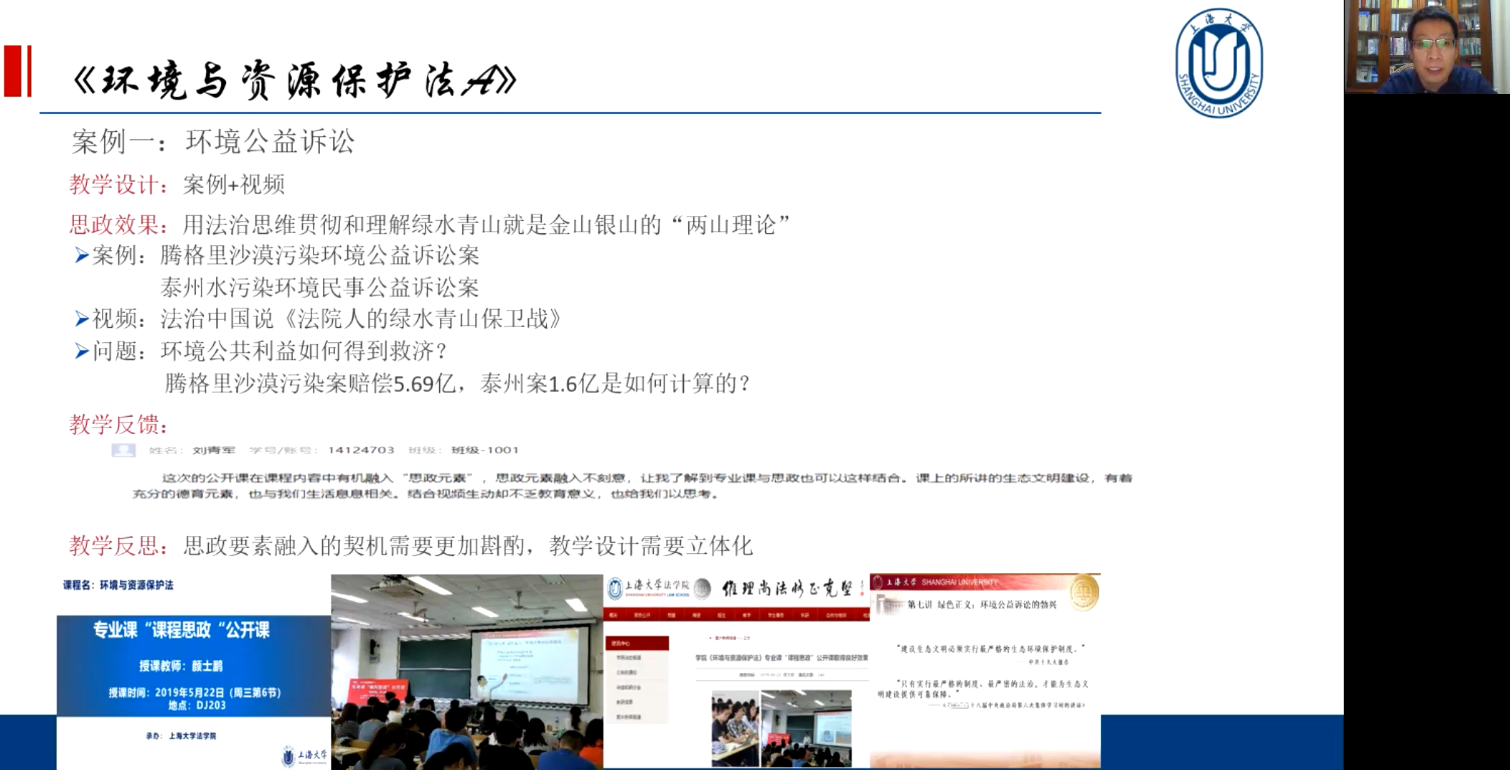 澳门pg官方电子平台颜士鹏副教授介绍了法学专业学科基础课《环境与资源保护法》课程思政示范课程的建设历程。该课程于2019年获得上海市本科重点课程立项,并获得澳门pg官方电子平台2019年度课程思政示范课程(专业课)培育课程立项,2020年被认定为澳门pg官方电子平台第二批研究型挑战性课程。
