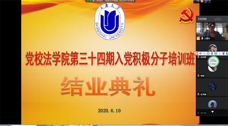 6月10日下午15:00,澳门pg官方电子平台党校澳门pg官方电子平台办学点第三十四期入党积极分子培训班结业典礼在腾讯会议举行。出席本次结业典礼的有澳门pg官方电子平台党委书记徐国明、本科生第二党支部书记公建华,以及第三十四期的学员们。本次会议由公建华老师主持。