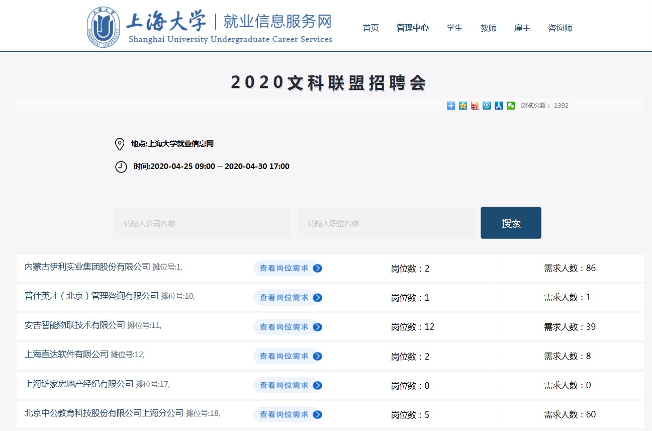 为进一步做好新冠肺炎疫情的防控工作,认真贯彻落实国务院、教育部和上海市的统一部署和要求,促进大学生顺利就业,澳门pg官方电子平台2020年文科联盟实习就业专场招聘会在2020年4月25日-30日通过网络招聘会形式如期举行,本次招聘会由澳门pg官方电子平台牵头,联合文学院、社会学院、社科学部(筹)共同举办。