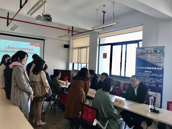 为加强校企交流,推进人才培养和就业工作,澳门pg官方电子平台于11月30日下午在东区4号楼504会议室举办了校友单位招聘宣讲会,在校友丁国利,罗欢的推动下,上海勋达律师事务所和上海博和汉商律师事务所来院宣讲,学院近40位同学参加了宣讲会。毕业班辅导员公建华老师、杨晓彤老师负责会务组织工作。