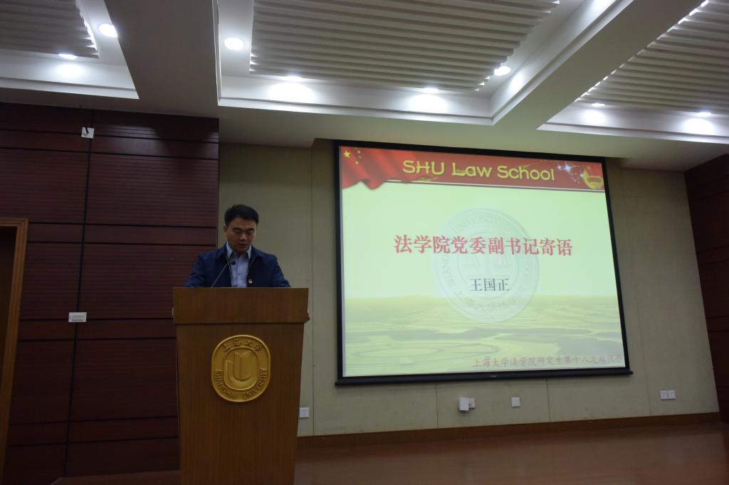 接着,澳门pg官方电子平台党委副书记王国正上台寄语,王老师说到:实现中华民族伟大复兴中国梦、实现党和国家长治久安、实现长期执政,必须坚持全面依法治国、依规治党和逐步完善中国特色社会主义法律体系,法学青年学子应对使命担当有深刻的认识。今年是落实学校第三次党代会的开局之年,学院正处于学科建设的爬坡上升期,同学们应以主人翁的意识融入学院事业发展中。最后王老师提出五点建议,希望同学们做法治意识的倡导者、法治理念的推动者、法治信仰的践行者、法学学科的建设者和优良学风的引导者。