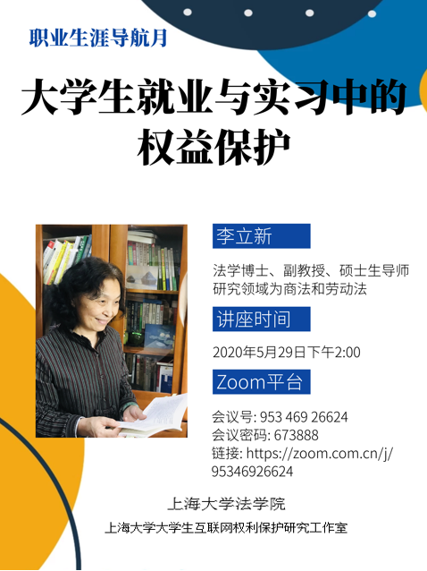 2020年5月29日下午2点,通过ZOOM线上平台,澳门pg官方电子平台教师李立新副教授面向全校、为毕业生们带来以《大学生实习与就业中的自我定位与权益保护》为主题的专场法律知识讲座。本次讲座活动在国家“保就业”方针政策指引下,结合“职业生涯导航月”工作安排,旨在为抗疫特殊背景下的应届毕业生们提供关于就业与实习法律保护的干货知识,助力于毕业生科学规避职业路途中的法律风险。讲座由“澳门pg官方电子平台大学生互联网权利研究工作室”负责人蒋英燕老师组织、策划并担纲主持。