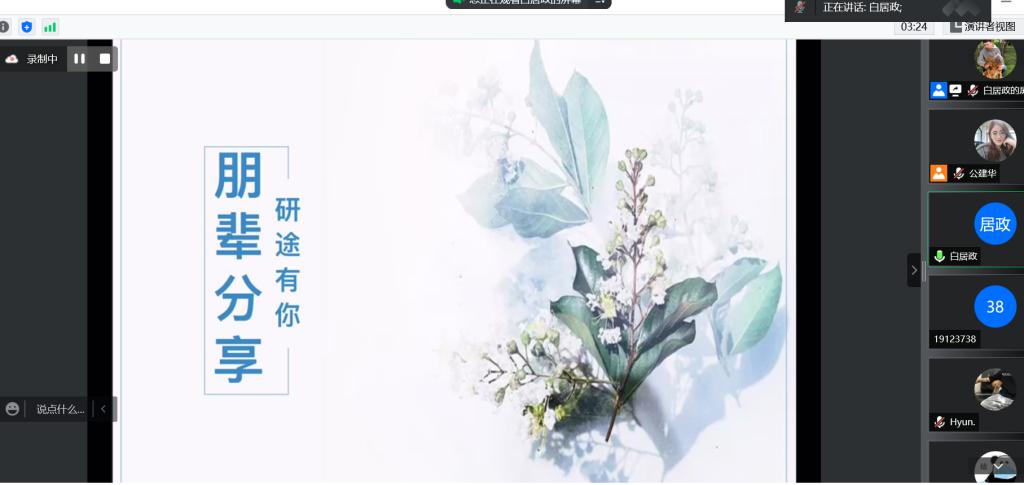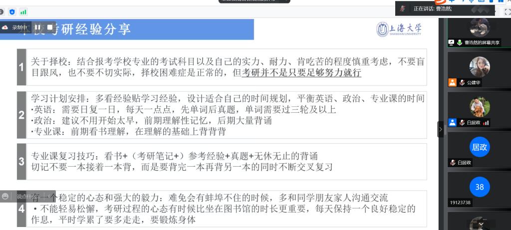 2022年5月19日晚上,澳门pg官方电子平台2022年考研经验朋辈分享交流会通过腾讯会议顺利举行。本次会议由澳门pg官方电子平台2018级本科生曹浩然、姬雪薇、彭建和黄振国做经验分享。澳门pg官方电子平台本科生辅导员公建华老师和30余位本科生在线参加。分享会由澳门pg官方电子平台2018级本科生白居政主持。