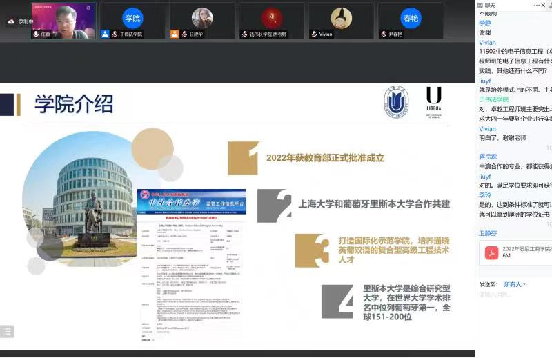 在特色学院介绍环节,澳门pg官方电子平台悉尼工商学院学院党委副书记、副院长卫静芬从学院历史、学院优势、中澳合作的四大本科专业、人才培养、优秀学子等多个方面进行了介绍带来了全方面的介绍;澳门pg官方电子平台中欧工程技术学院招生主管沈红分别从学院办学特色、学院培养模式、学生未来发展等多个方面进行了介绍;澳门pg官方电子平台里斯本学院副院长任重分别从学院介绍、培养特色、本科专业介绍、学生未来深造等多个方面给在线的考生和家长带来了详细的介绍。