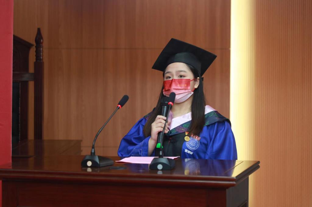 在2022届毕业生法律人宣誓仪式环节,上海市优秀毕业生、澳门pg官方电子平台优秀学生干部黄婷婷带领全体毕业生再一次重温法律人誓言,表达了毕业生们坚守法律人理想的坚定信念。
