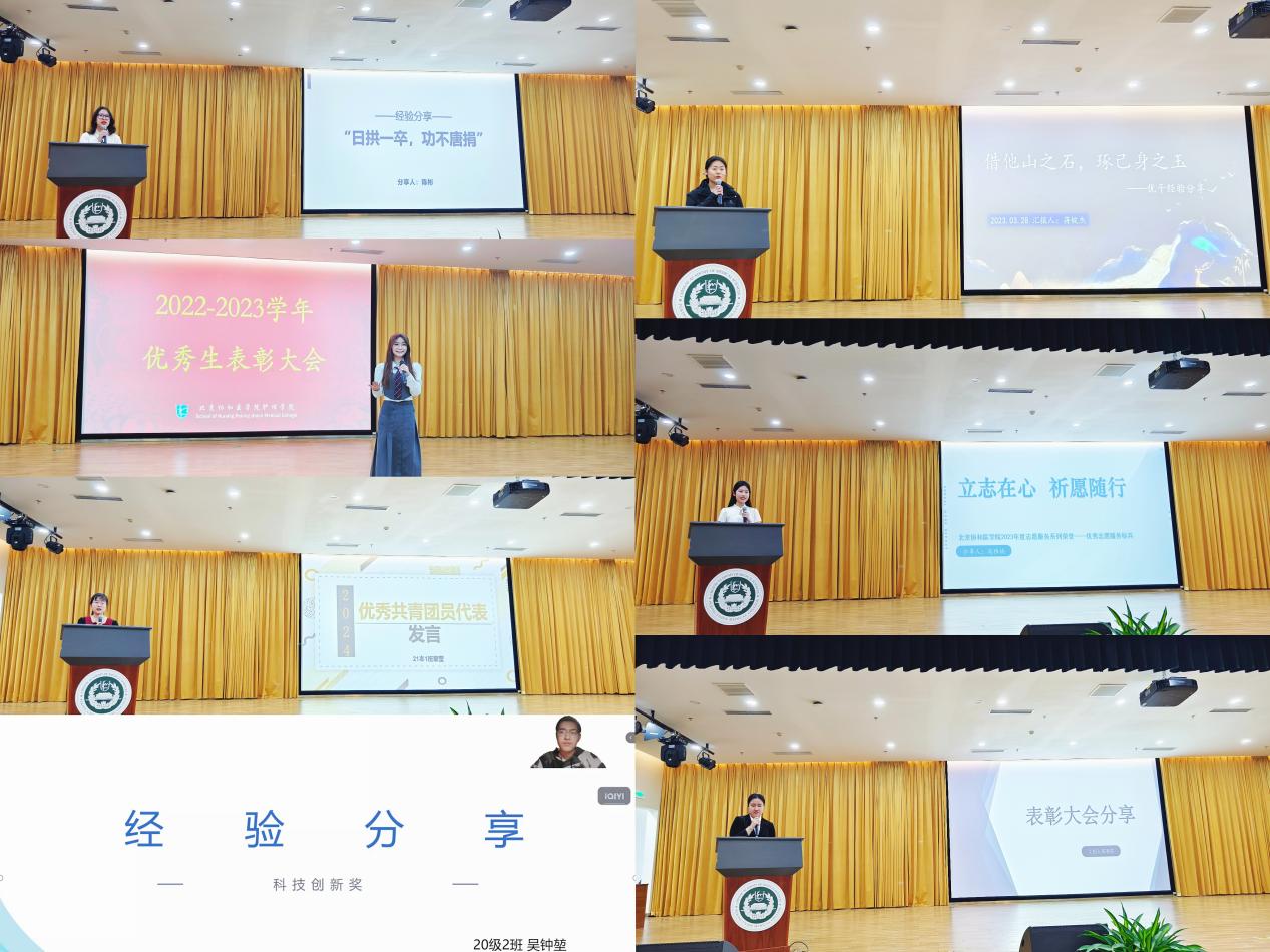在庄严的国歌声中表彰活动拉开帷幕。大会对过去一年荣获国家级奖学金、校级奖学金、院级奖学金的学生,以及荣获各级表彰的优秀班集体、三好学生,优秀班干部、团干部、优秀团员等学生进行表彰。在经验分享环节, 20本吴钟堃,21本章莹、陈新荻、陈彬,22本蒋锭杰、高雅楠、李金秋七位同学作为各奖项代表上台讲述自己的故事,向同学们展示在学习方法、科学创新、工作技巧、文体特长、志愿服务等方面的优异表现与经验,纷纷表示要以更饱满的激情、更激昂的斗志、更优异的成绩,谱写更加辉煌灿烂的新篇章。